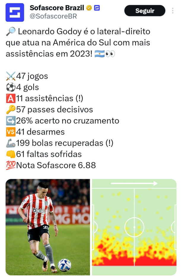 Position principale: Arrière droit. Informations et faits . Nom dans le pays d'origine: Leonardo Ezequiel Godoy Naissance (âge): 28 avr. 1995 (28) Lieu: Concordia Taille: 1,73 m Nationalité: Argentine Position: Défense - Arrière droit Pied: droit Agent du joueur: FC3 Sports Club actuel: Club Athletico Paranaense Dans l'équipe depuis: 11 janv. 2024 Contrat jusqu'à: 31 déc. 2027.