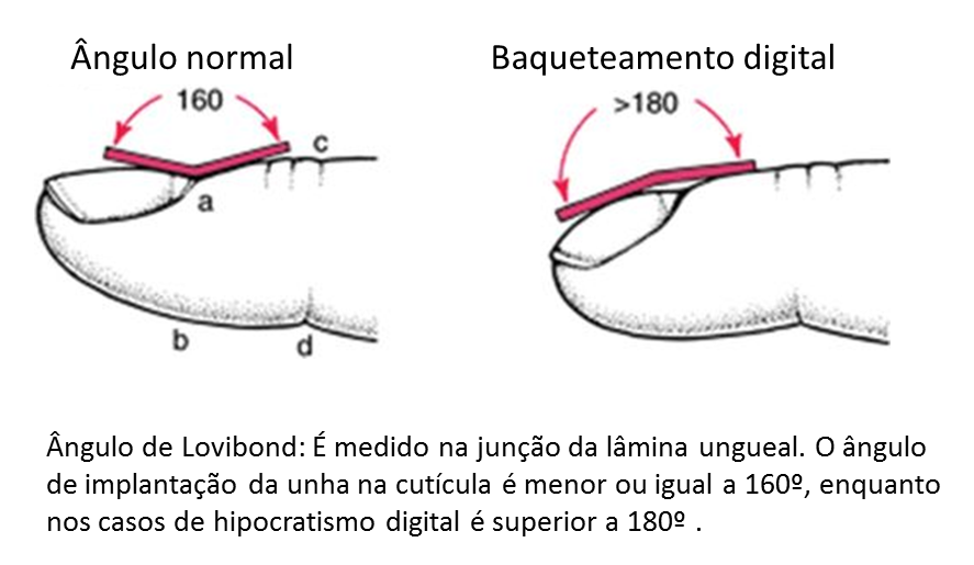 O baqueteamento digital também é caracterizado pela perda do ângulo normal no leito ungueal.. Em geral, o estridor é mais intenso que o sibilo, é predominantemente inspiratório e é auscultado com mais intensidade sobre a laringe. Deve provocar a preocupação com a obstrução de via respiratória superior, que coloca a vida em risco..