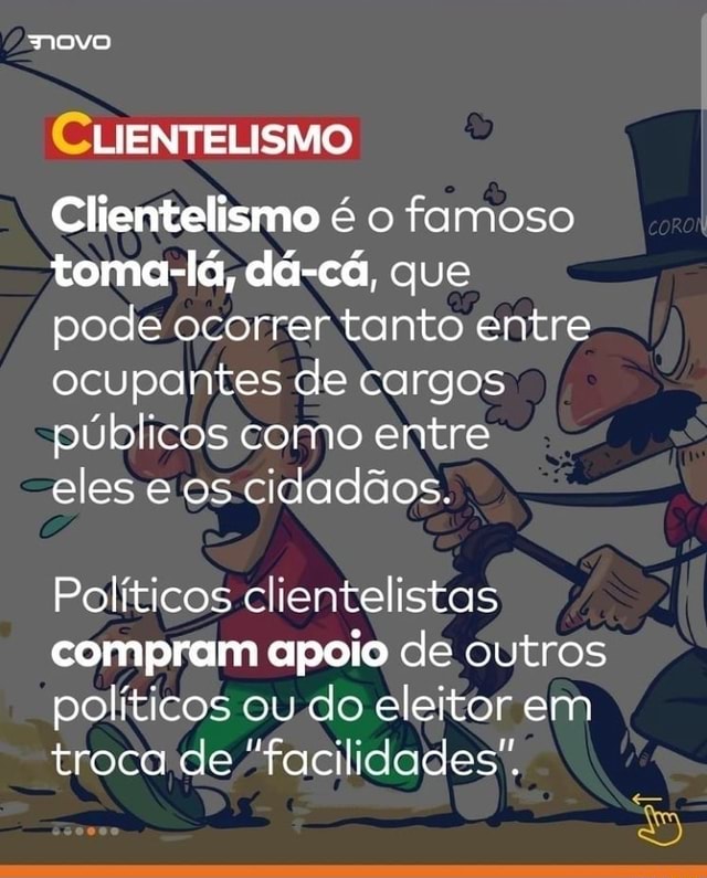 Novo CLIENTELISMO Clientelismo é o famoso tomalá, dácá, que pode ocorrer tanto entre ocupantes