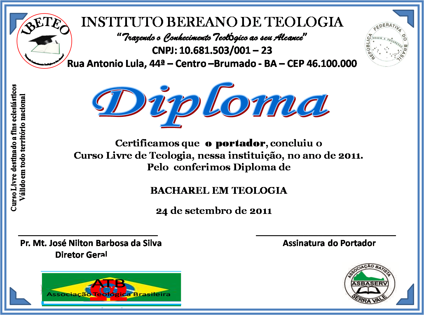 IBETEO INSTITUTO BEREANO DE TEOLOGIA MODELO DE CREDENCIAL E DIPLOMA