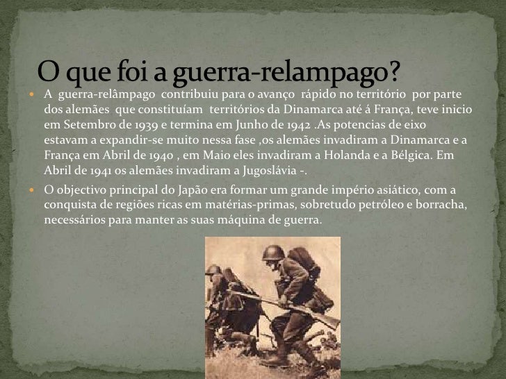 A guerra relâmpago que revolucionou o mundo. A famosa Blitzkrieg ou guerra relâmpago constitui-se na inovadora doutrina de guerra desenvolvida e posta em prática pelos alemães durante a Segunda Guerra Mundial, permitindo que estes dominassem quase toda a Europa de forma rápida e com notável eficácia. Mas afinal, em que consistia tal.