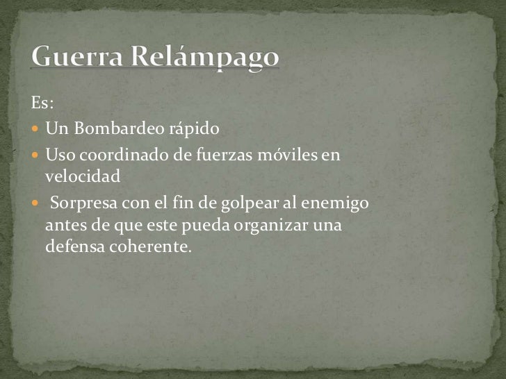 A noção de Guerra Relâmpago surgiu na década de 1940 graças ao interesse que Adolf Hitler tinha para fazer de seu avanço e conquista sobre a Europa algo efetivo e imediato. Assim, junto aos líderes militares do Terceiro Reich, Hitler idealizou uma estratégia militar que se caracterizaria pela realização de diversas colunas militares de maneira simultânea com o objetivo de gerar.