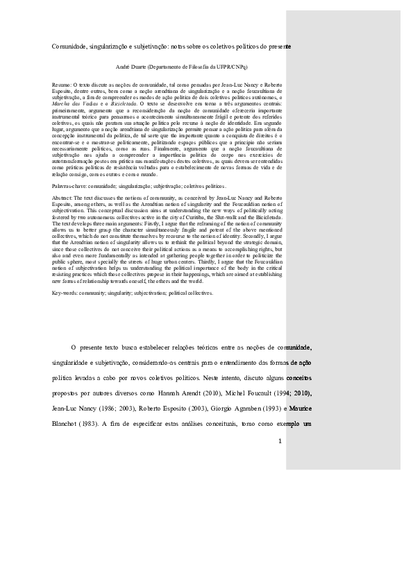 (PDF) Comunidade, singularização e subjetivação notas sobre os coletivos políticos do presente